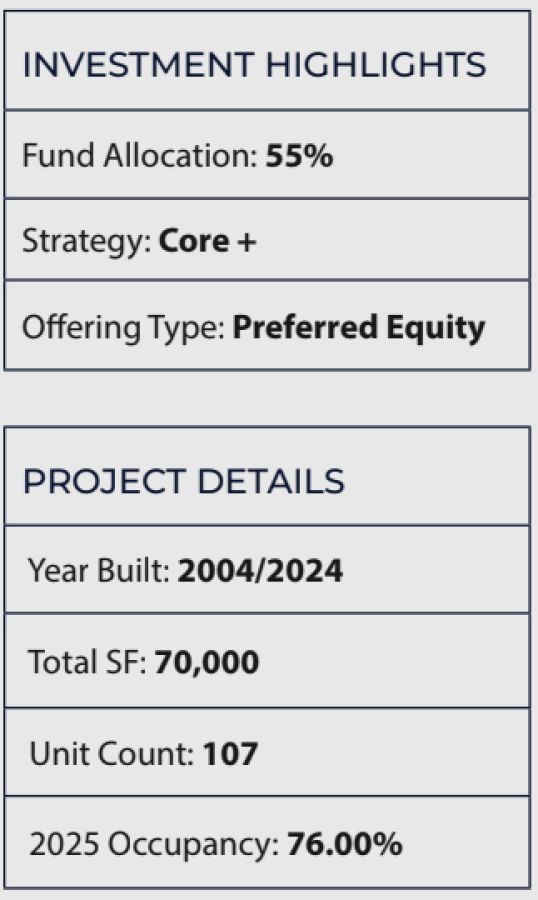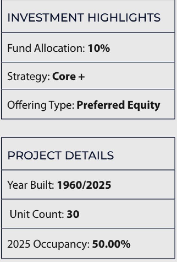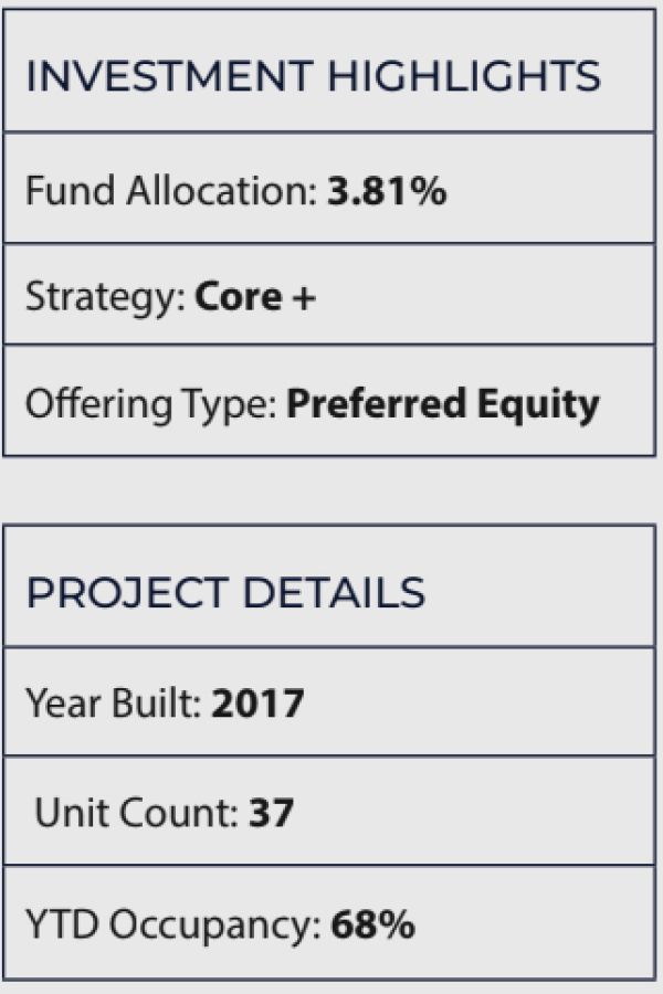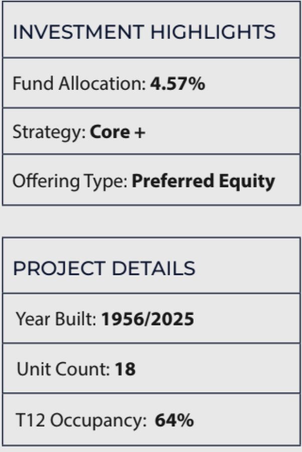 Formerly the Drifter Hotel, this asset has undergone a comprehensive repositioning into a four-star boutique property through significant sponsor-funded CapEx. As a pre-opening investment, the fund’s entry point is at an attractive basis, enabling meaningful upside as operations stabilize. The limited allocation mitigates early-stage exposure while offering investors participation in the ramp-up of a high-margin boutique asset in a dynamic New Orleans submarket.
